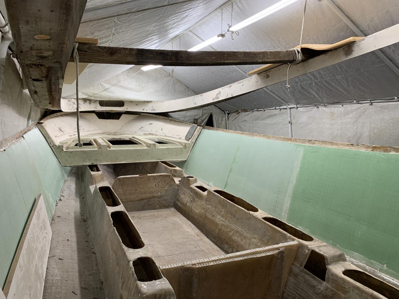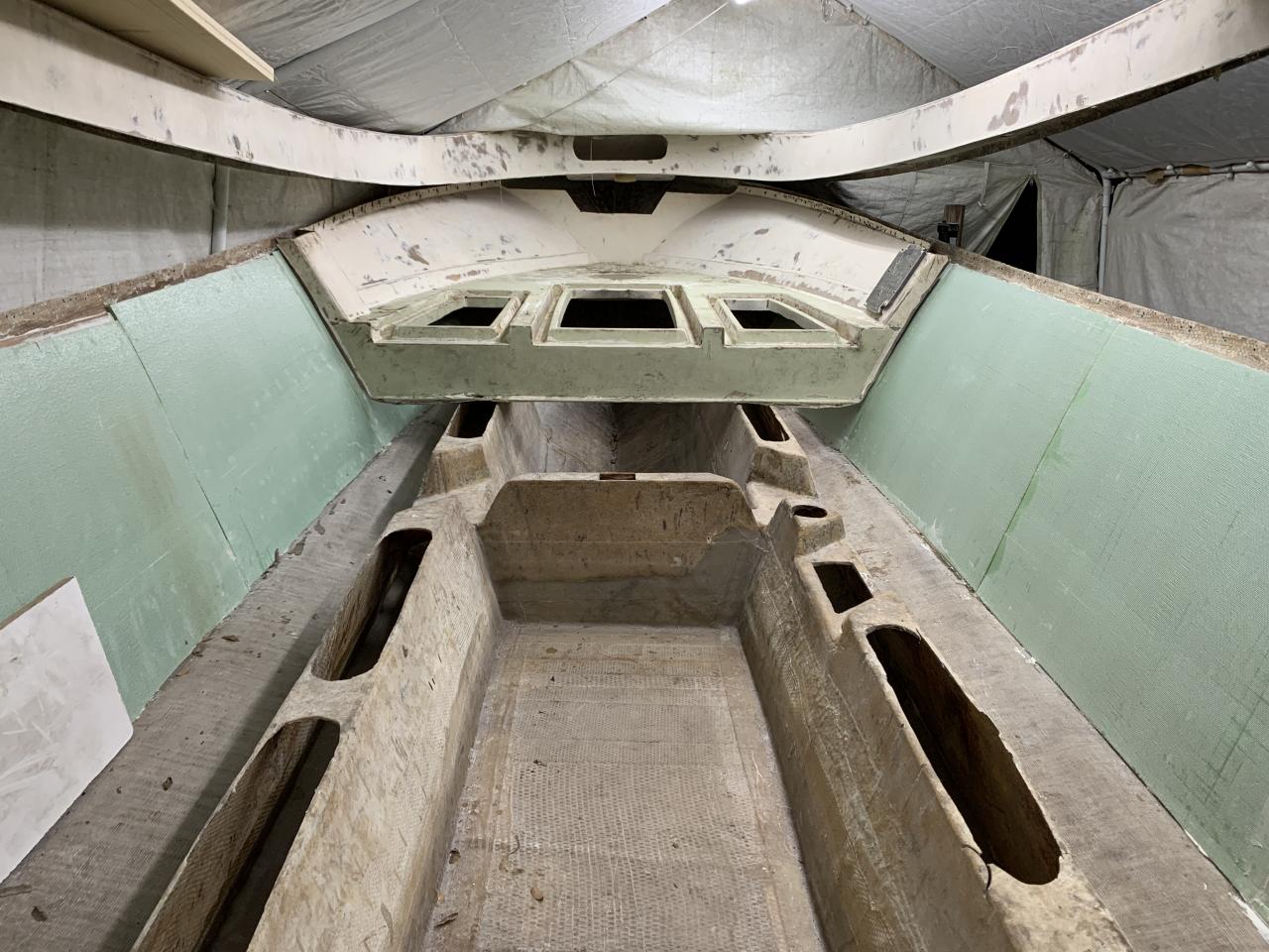 Mocked up the casting deck to check clearance before laminating the hull sides. Should be clear and able to laminate the liner to the hull skins. Need to finish the storage binds and laminate/insulate them.