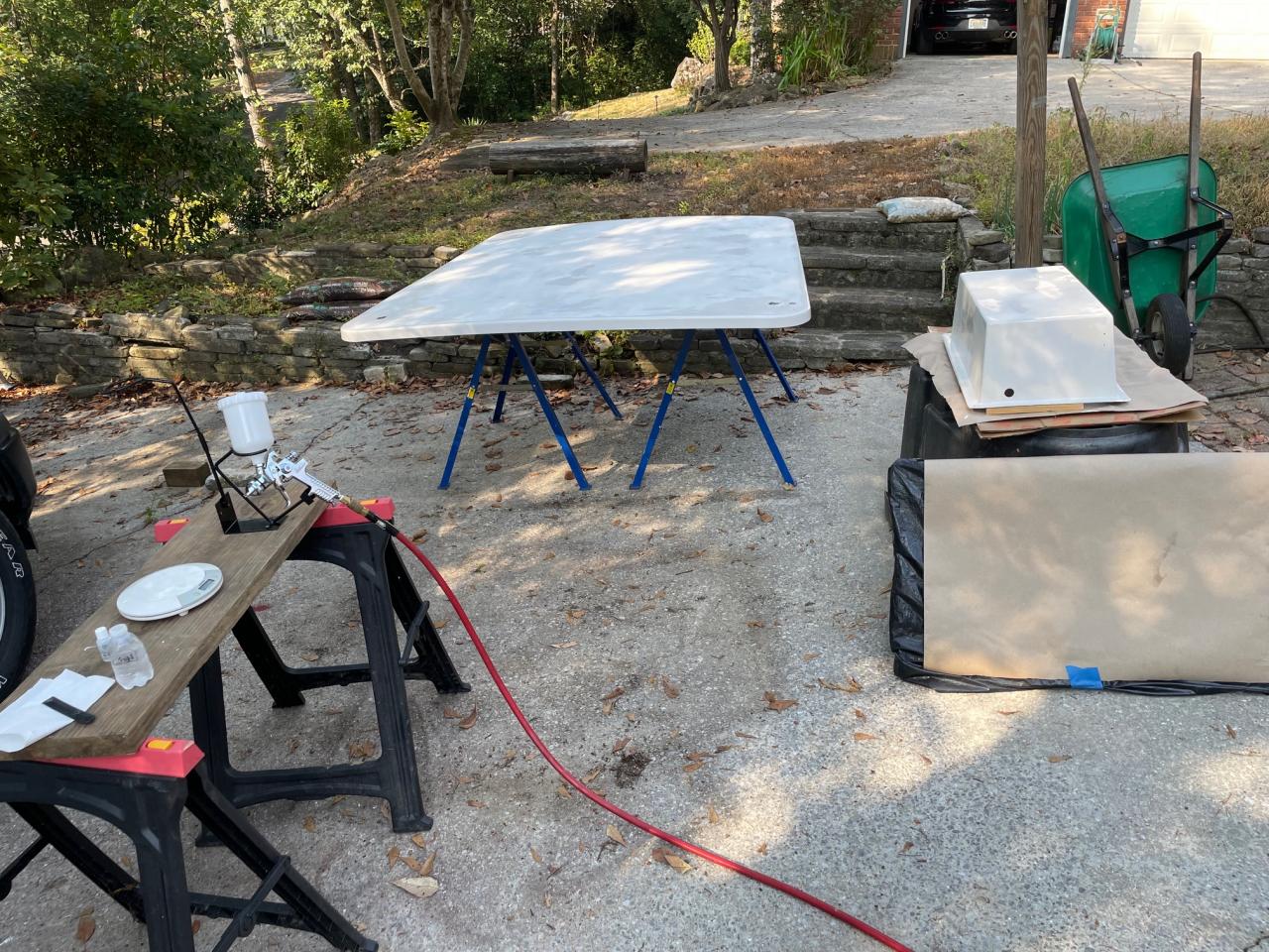 Although I haven’t posted lately, work is continuing. This is my rig for spraying gel coat on the top and electronics box. I bought a new spray gun from a Canadian company (