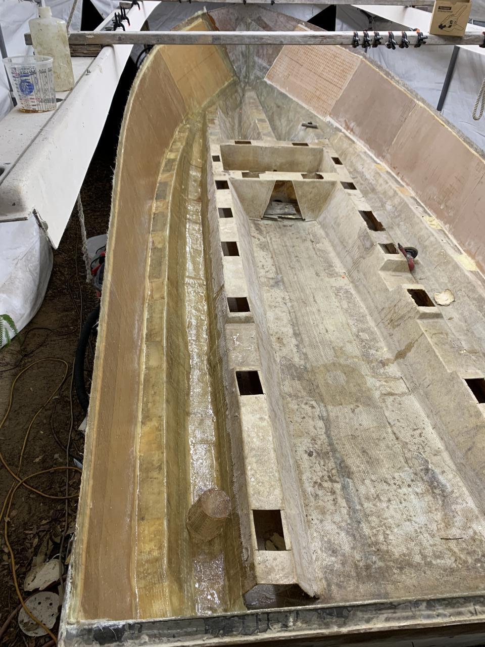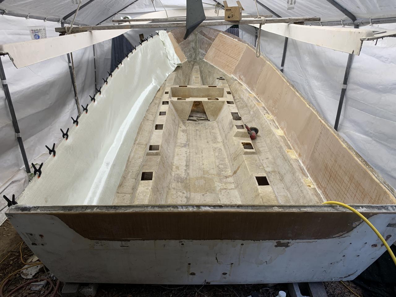 Flatback 22-2 Rebuilds / Re: 1970 Flatback 222 - Barn find Revival« Last post by Ulysses485 on September 15, 2025, 12:39:44 PM »Filled the stern side of the outboard stringers with foam back in mid August sanded down. I decided to take advantage of the nicer weather this past weekend and get all the hull side coring capped with a layer of 1708. While I was there I decided to add a layer of 1808 in between the outer stringers kind of "down in the valley" where the resin wanted to migrate to anyhow.
