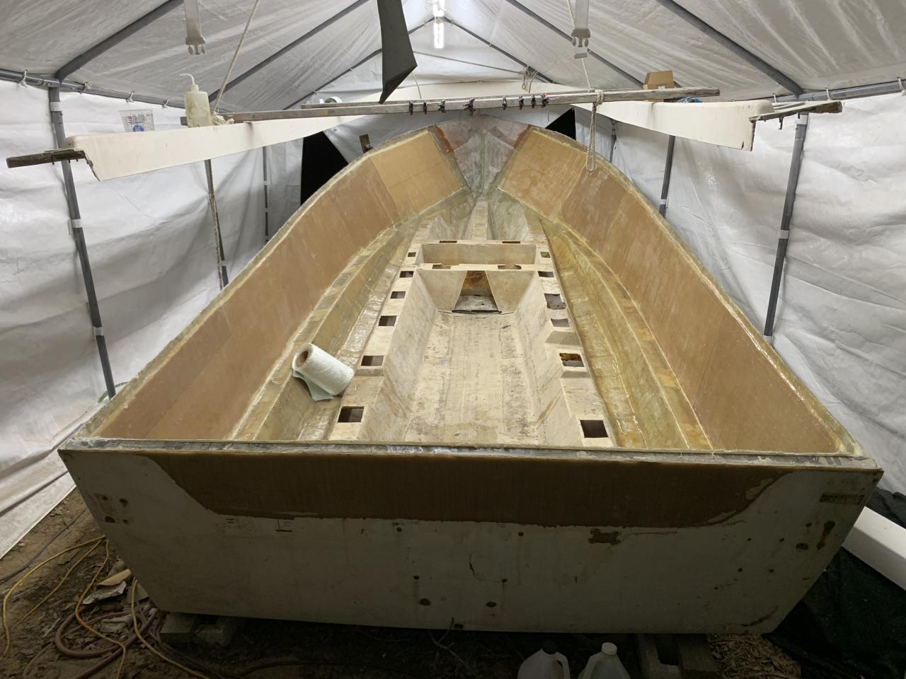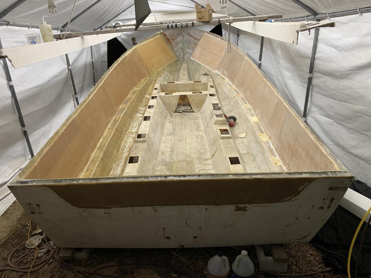 Even though this is only 1/4'' Divinycell coring, I am extremely impressed with how rigid it is now. Pushing up on the bow and there is very little flex. I did one side each night this weekend with each side taking approximately 2.5gallons of polyester resin and one (1) 30'' x 21ft long piece of 1708. I was very happy with how smooth it went, all in 40oz batches. I guess I need a fuel tank sooner than later to go in the empty pocket so I can get a deck installed!! ![]() ![]() ![]() ![]() ![]() 70