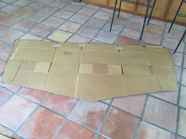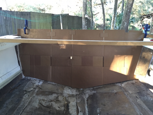 If you are going full transom and want the top to have a curve in it, you can use a 8' price of 1/2 pvc pipe. Just attach at the hull sides and lift up in the middle till you have it where you like it. Then trace the line it makes. As for making the template, put up the cardboard on the outside and trace from outside. Cut on the line and it will fit inside the hull without issue.