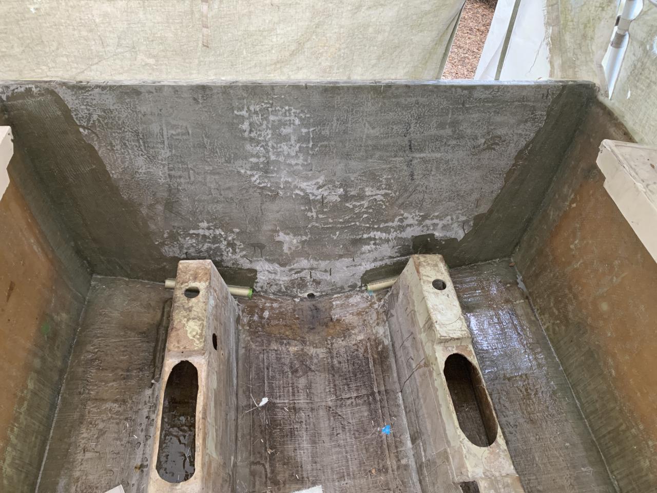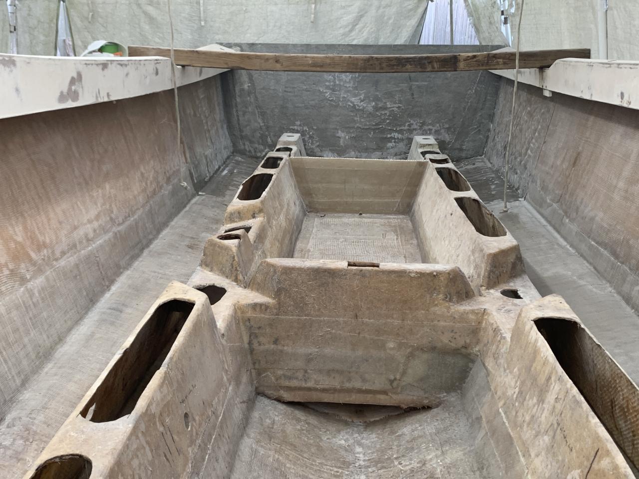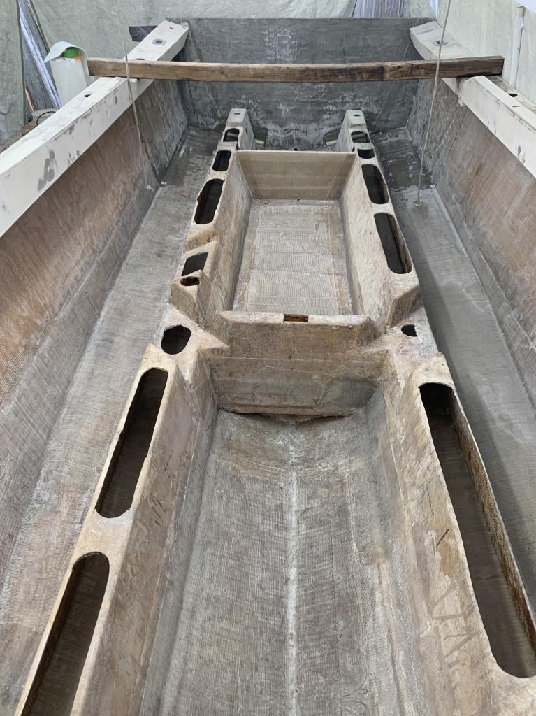 Now that the structural work is getting close to being done, I need to work on the look good parts! The casting deck is pulled out and moved to another carport "The small Parts Department...LOL". It needs recoring and the storage/fish boxes re-glassed to underside. Storage boxes will receive new ice blue gelcoat finish before getting glassed back.